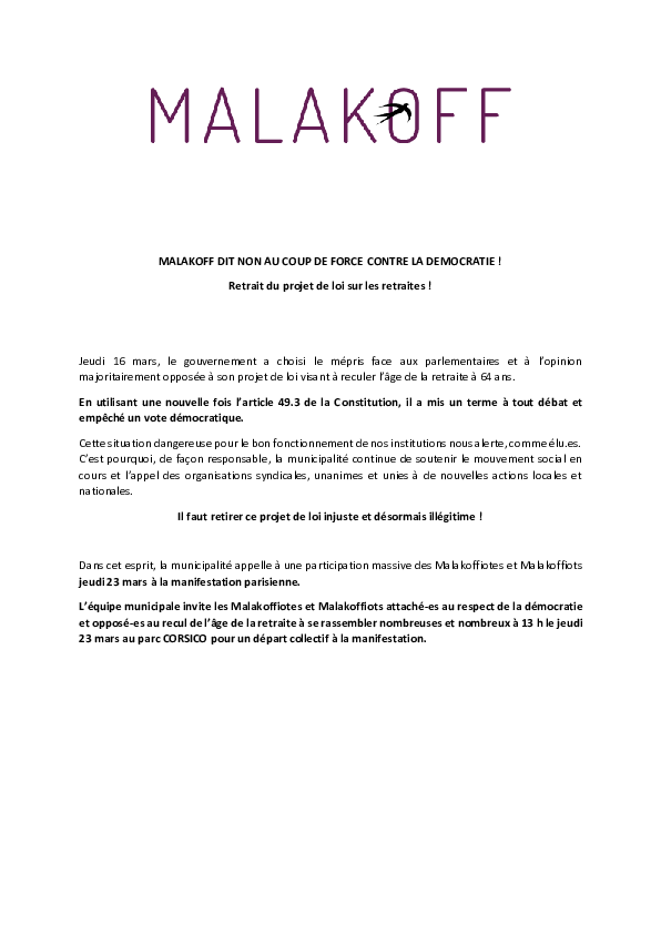 Malakoff dit non au coup de force contre la démocratie et demande le retrait du projet de loi sur les retraites